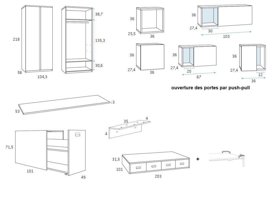 – Un lit couchage 90 x 190 cm composé de 4 coffres de rangement à fermeture amortie